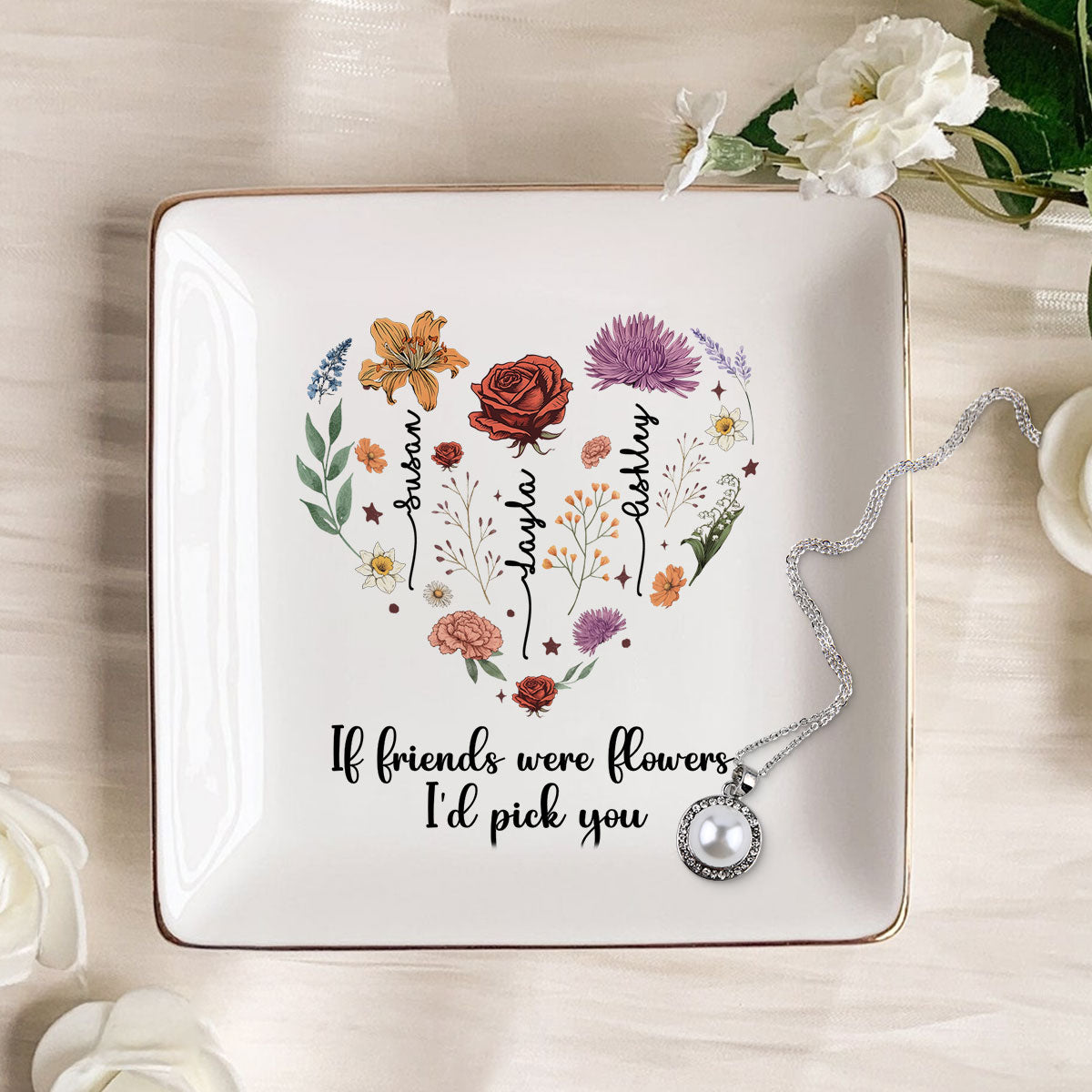 Birth Month Flowers Sisters Besties Friends Heart Personalized Jewelry Dish