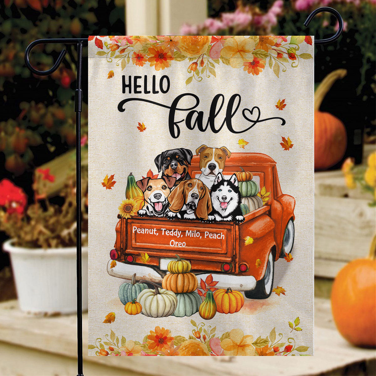 Imagine your garden adorned with a delightful flag featuring your beloved dogs, riding through the golden leaves of autumn in a charming old truck. This personalized garden flag isn’t just a decoration—it's a warm, welcoming touch that turns your outdoor space into the coziest spot in the neighborhood. Every glance will remind you of the joy your pups bring to your life, perfectly capturing the essence of fall.